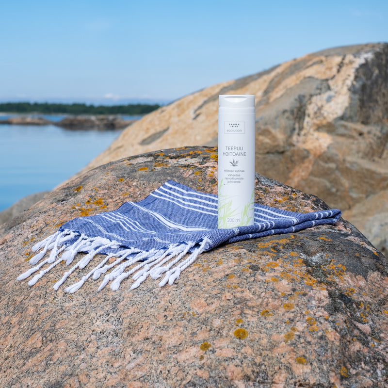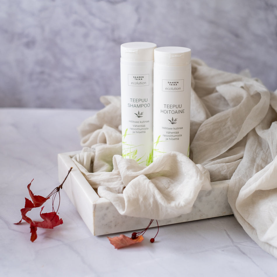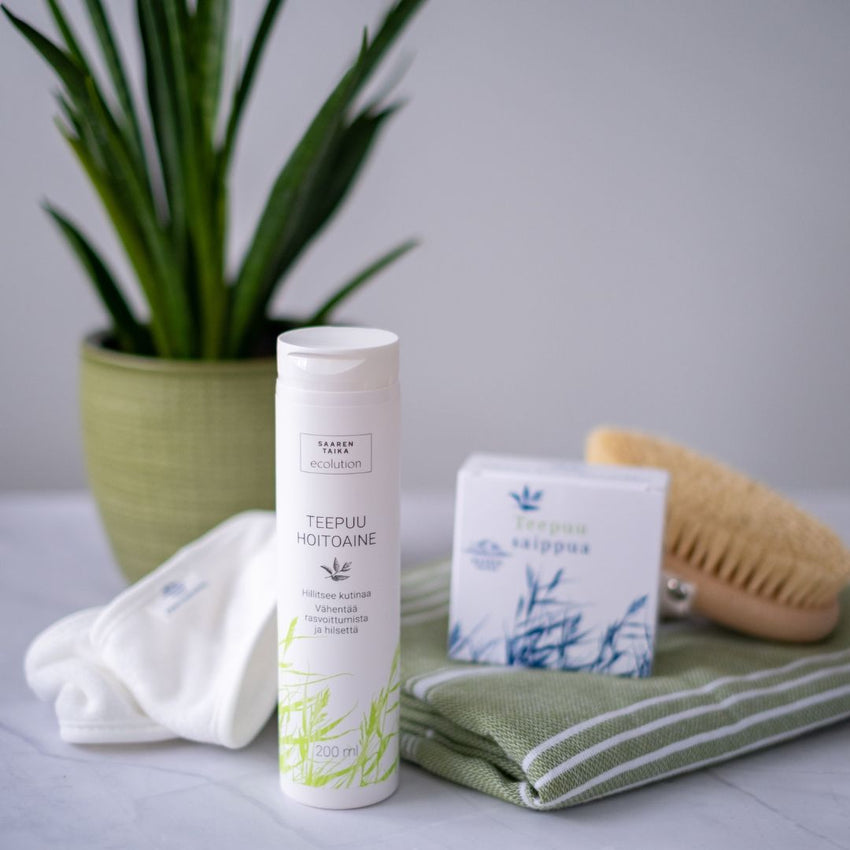 Saaren Taika flytande Tea Tree balsam behandlar och återfuktar ditt hår, ger det volym och vacker glans. Den lätta sammansättningen av det effektivt behandlande Tea Tree Conditioner absorberas snabbt i håret och lämnar det mjukt, smidigt och lätt att hantera. Detta balsam ger håret näring på djupet och hjälper till att återställa dess fuktbalans, vilket gör att håret känns lätt och luftigt.